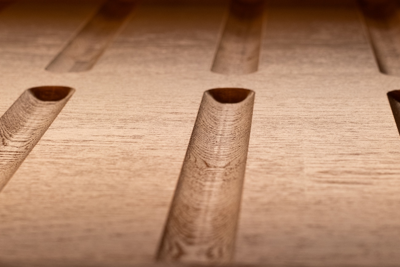 Champagnekällaren är inte bara en förvaringslösning – det är en visuell upplevelse. Varje skiva har frästs och anpassats för att optimera både flaskförvaring och estetik. Resultatet är en elegant, nätt och slitstark lösning som både är praktisk och håller över tid.